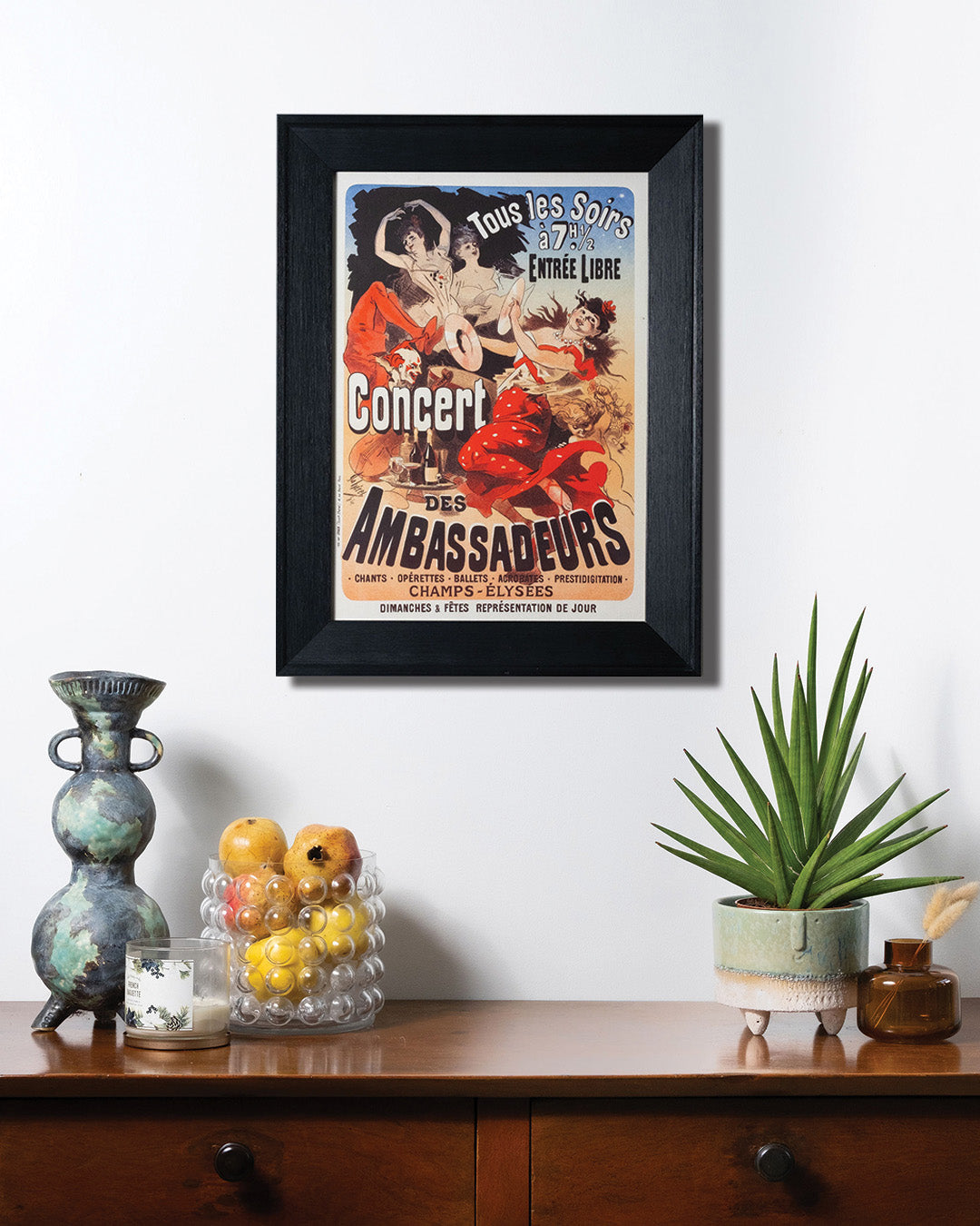 "Concert des Ambassadeurs" (1899) is a captivating artwork by Jules Chéret that brings the energy and excitement of a musical performance to life. The poster's dynamic composition, vibrant colors, and expressive figures capture the joy and vivacity of a concert, inviting viewers to be swept away by the enchanting atmosphere.