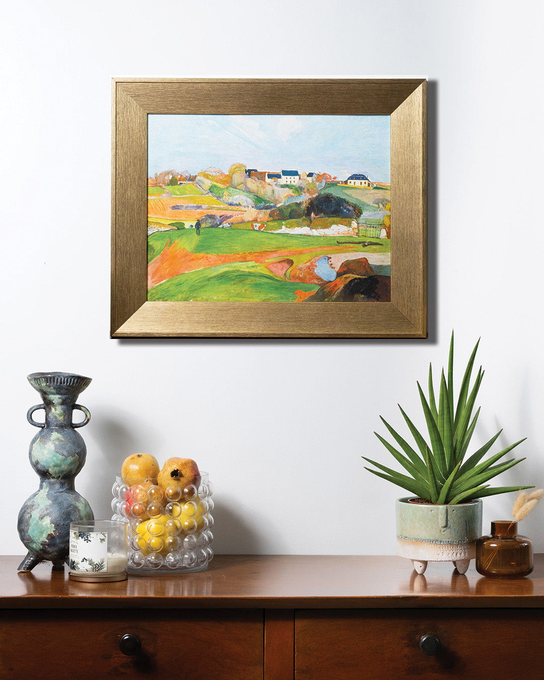 Landscape at Le Pouldu (1890) by Paul Gauguin captivates with its vibrant palette and stylized forms, transporting us to the rugged beauty of the coastal village and immersing us in Gauguin's quest for artistic expression beyond the confines of reality.